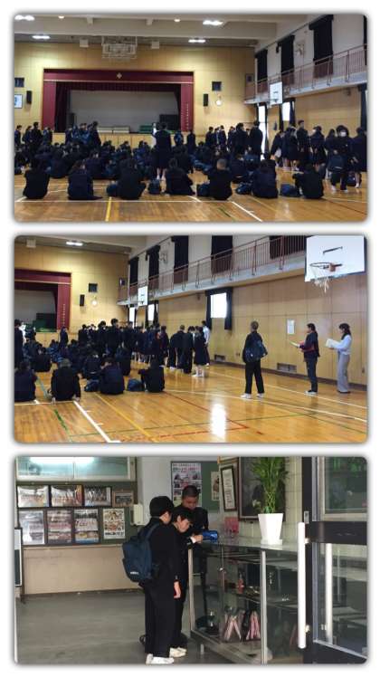 11月16日(木)・17日(金)に行われる「職場体験学習」の各事業所への事前訪問をしました。体育館で諸注意の後、事業所ごとにグループに分かれて学校を出発し、あいさつや事前の打ち合わせをして帰校しました。