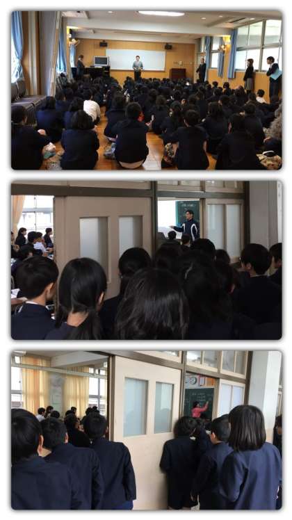 11月21日(火)午後、日吉小学校6年生3クラスの皆さんが、堀江中学校に中学校体験に来ました。はじめに、藤木先生から体験についての説明をしていただいた後、各授業を見て回りました。中学生も幼なじみの小学生に笑顔でこたえ、訪問を歓迎していました。