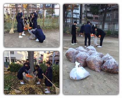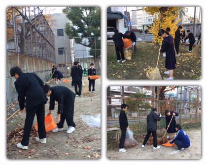 12月5日(火)〜8日(金)までの5日間、生徒会を中心としてボランティア清掃「堀江クリーン大作戦」を実施しています。今日はその初日でした。朝早くから生徒85名がボランティア活動に参加し、堀江グランドの落葉を一生懸命に集めてくれました。おかげでグランドがすっきりとしてきました。明日は校内清掃です。