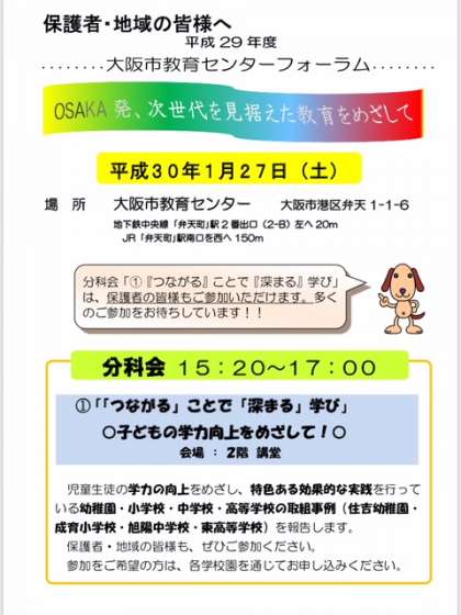 1月27日(土)午後から実施される「大阪市教育センターフォーラム」の分科会(1)(15:20〜17:00)に保護者の方々も参加が可能です。児童生徒の学力向上に向けて、特色ある効果的な実践を行っている校園より報告等がありますので、ご希望される方は、教頭までお電話ください。(電話番号:06-6531-7868)