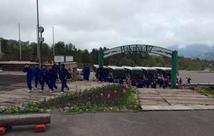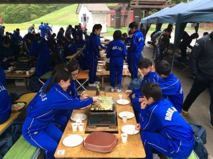 バスでバーベキュー会場に移動し、班ごとに食事です。