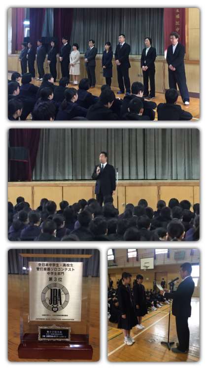 表彰式では、ソロコンテストで全国第3位になった新3年生の脇田さんと、ピアノ伴奏の大役を果たした峰高さんの表彰を行いました。