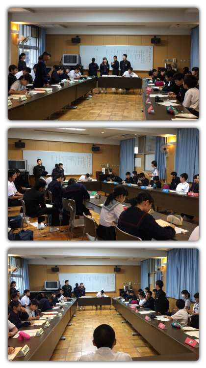 5月8日(火)放課後、各クラスの委員長、各委員会の委員長、生徒会役員で生徒議会が行われました。各クラスでの問題点をあげ、それに対する改善策を考えました。特に、忘れ物が多いこと、授業中に寝ている人がいること、遅刻があることについては、終学活や各授業でよく忘れ物をする人や寝ている人に声かけをしたり、事前に忘れ物がないよう、また時間に遅れないよう連絡したりするといいのではないかという意見が多く出ました。
