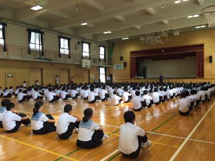 5月28日(月)3年生は修学旅行中ですが、1・2年生だけで集会をしました。三好先生から緊急に、「登下校および習い事等の往復時の安全について」お話をしました。