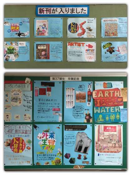 図書室からです。新刊が入ったので、多くの本を読みに来てください。最近たくさんの人が本を借りています。5月の総貸出冊数は223冊に昇っています。