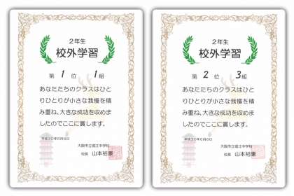 6月7日(木)2年生は学年集会で、校外学習で実施したオリエンテーリングの表彰式を行いました。雨に打たれ、鹿にカードをかじられながらも、めげずに頑張るだけでなく、時間をしっかり守れた2年生を褒めてあげたいと思います。表彰は次のとおりです。