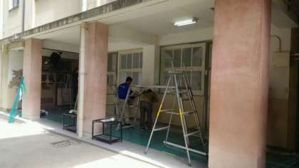 養生シートの貼りつけ、マスキング、壁の下補修(平らにする作業)などテキパキと作業が進んでおり見事です。さすがはプロの集団です。何事も下準備が大切ですね。