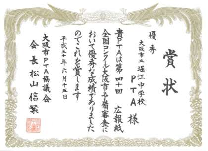 作成に当たっては、広報委員の皆さんが、構成に創意工夫を重ね、写真を何千枚と撮影された中から抽出し、何回も校正をかけてやっと完成するものです。堀江中学校のPTAだよりの表彰は、担当された広報委員さんの努力の成果でもあり、本当にうれしく思っています。PTAの活動のみならず、子どもたちの教育活動を支援しているPTAとしても紙面を考え、特に学校行事で陰の力となって頑張っている生徒や教職員にもスポットを当ててくださいました。これからもよろしくお願い致します。