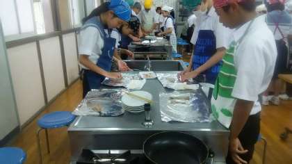 6月20日(水)、2年生の家庭科の授業で調理実習を行いました。「イワシの手開きなんてはじめてで・・・」という生徒がほとんどで、堤先生の実演と説明ののち、イワシを手開きし、カレー入り小麦粉をまぶしフライパンで焼きました。