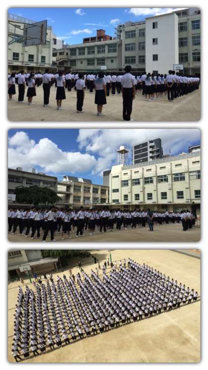 堀江中学校の校訓「誇り・理想・笑顔」もその歴史を踏まえて作成されています。60周年記念冊子には、全校生徒の全体写真も掲載するため、今日は向きを反対にして圧縮した隊形で並び直し、無事、写真撮影も終了しました。生徒たちは暑い中、よく集中して頑張っていました。