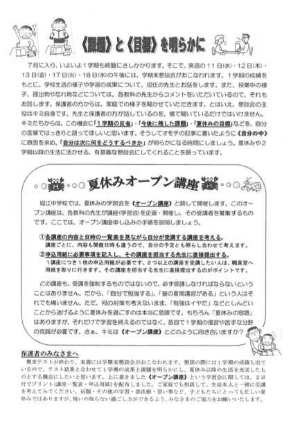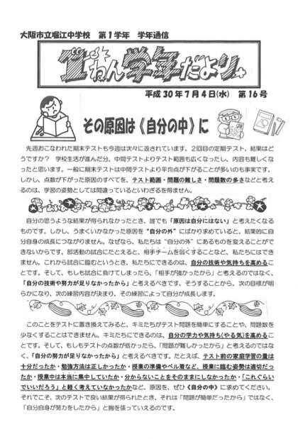7月4日付で「1年学年だより第16号」を発行しました。「期末テストの結果をふまえてその原因を考えること」「今後、何をどうしていくべきか」等について書かれています。一つ一つのテストを区切りとして、自己の学習方法の見直しをしてください。