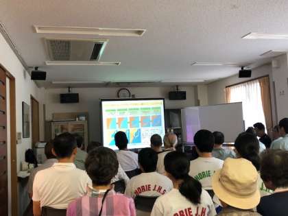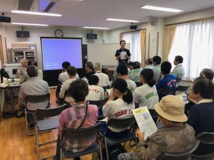 この間の豪雨の影響で避難所開設訓練や救急・消火訓練などはできず、会館内で堀江地域の防災予備知識や地震・津波に関するお話を聴かせていただきました。先日の大阪府北部を震源とする最大震度6弱の地震の後であることや、豪雨の直後でもあり不安感や緊張感のなか、あらたな学習をすることができました。ありがとうございました。