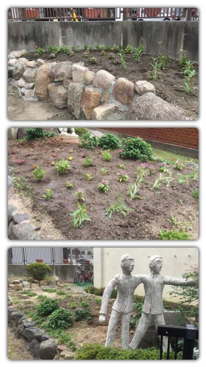 7月12日(木)管理作業員の堤さんと元気アップコーディネーターの薮内さんに暑い中ではあったのですが、花壇に花の苗の植え付けをしていただきました。「種から育てる地域の花づくり事業」をすすめておられる西区緑化会からいただいた花苗を植えました。植えたばかりなのでまだまだこれからですが、潤いのある美しい学校づくりをめざしています。ペチュニア・千日紅・ダリア・コリウス等、それぞれの成長が楽しみです。
