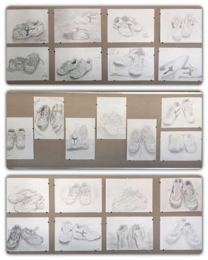 職員室前廊下の掲示板の生徒作品の入れ替えが、7月中旬ごろに行われました。今回は、1年生の「靴のデッサン」です。担当の先生からのお話によると、今年の1年生は味のある素晴らしい作品を描く生徒が多いとのこと。また、それぞれの作品について感想を話し合う活動においても、多角的に作品の良さを捉えることができ、いろんな感想や意見が言えて、グループでの話し合い活動と発表はとても充実していたということでした。友達の作品や意見をききながら、次はまた自分の作品に生かしてほしいと思います。