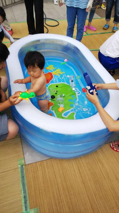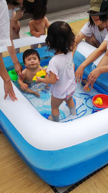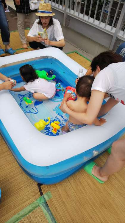 少し早目に到着しプールの水入れなど準備を手伝い、おもちゃを遊びやすいように配置しました。10時少し過ぎに1組目の親子が来られ、それからどんどん元気な赤ちゃんたちが来場されました。