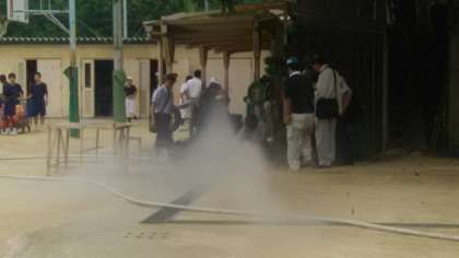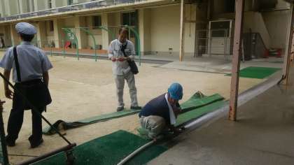 火災が起こった場合に消火活動に使用する消火管が、大変老朽化しているため、夏季休業を利用して改修(露出化)した工事の大阪市からの検査が本日終了しました。近隣の皆様にはご理解とご協力を賜りましてありがとうございました。(写真は8月28日に行われた西消防署による水圧の検査です)