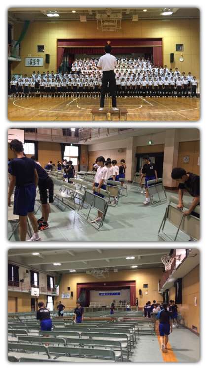 明日の合唱コンクールに向けて、男子バレー部と卓球部の皆さんが放課後に準備してくれました。また、今年は素敵な舞台上の看板も出来上がりました。