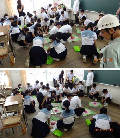 画像は「心臓マッサージ」「AED」の体験の様子です。