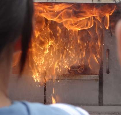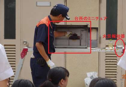 台所のミニチュアを使って、てんぷら油を火にかけ、油を熱し続け、煙が出る→小さな炎がでる→水をかける(やってはいけない)という実験を見せていただきました。
