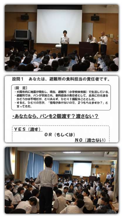 2年生の「防災訓練」と並行して、1年生は「防災教室」を区役所の方に来ていただいて実施しました。