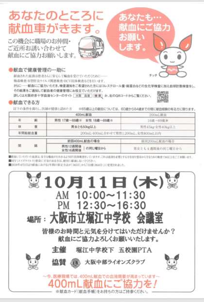 来る10月11日(木)に堀江中学校に献血車が入ります。例年5校園のPTAが主催して実施されている献血活動を今年も行います。ふるってお越しくださいますようお願いいたします。