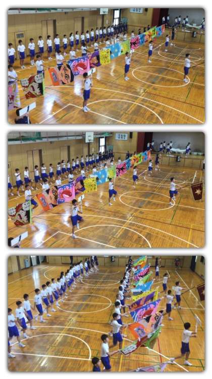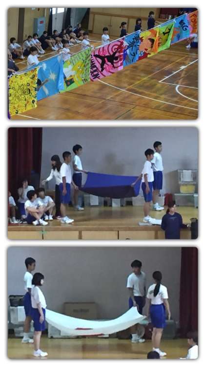 中間テストが終わり、来週は体育大会の週になりました。まず、月曜日には全体練習が1・2限目にありますので、基準者となる先頭の人たちの練習をしました。プラカード、学級旗等を持ってさっそうと行進します。体育館は幅がないのですぐ突き当りですが、色とりどりの旗を掲げ、横の列を意識しながらきれいに行進が揃うと圧巻です。月曜日の全体練習で今日の成果を発揮してください。