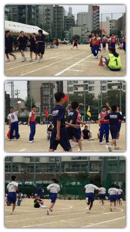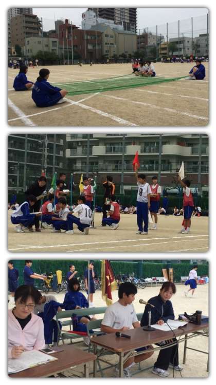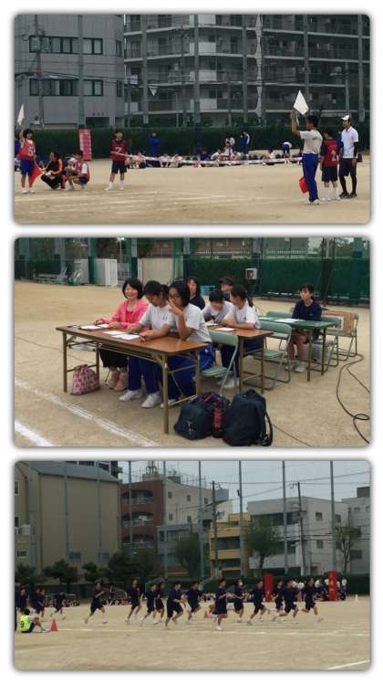昨年のようなお天気の心配もなく予行が始りました。広々としたグランドに圧倒されながらも、いつもどおり入場行進・開会式の予行を終え、各種目のレースも一通り実施しました。今日は予行なので、各係の役割を確認したり、走者の人はコース等を確認したりしました。明日の本番に向けて、流れはバッチリです。