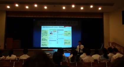 本校の生徒会は、情報機器のアンケート結果をもとに、情報機器の所持の状況や使用時間、アプリの利用率などから、考察した結果を報告し、情報モラルについて考えることの大切さを訴えてくれました。