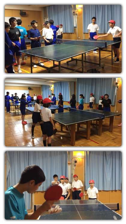 写真は、野球部、卓球部、家庭科部の様子です。笑顔で楽しく活動しています。中学生は2日目なので少し余裕できた様子です。