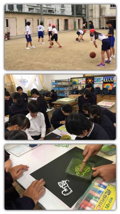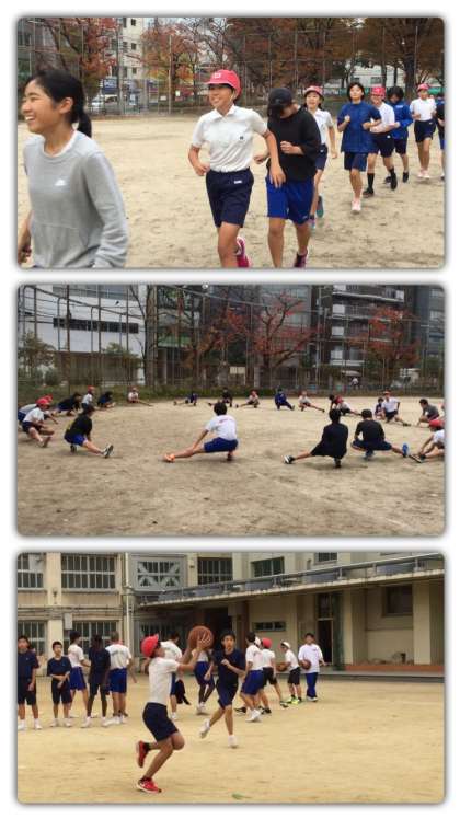 写真は、陸上部、男子バスケット部、女子バスケット部、美術部、男子バレー部の様子です。中学生と一緒にトレーニングや試合をしたり、クリスマスの作品をつくったりしました。