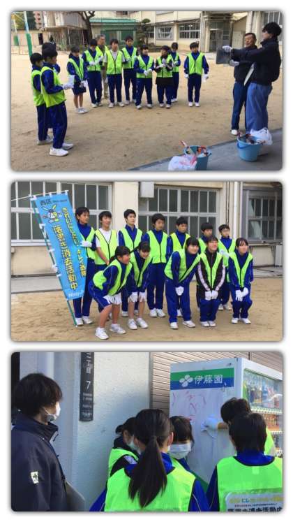 まず、きれいにしたい(キレイ西隊)の落書き消し隊の皆さんは、何と46箇所もの落書きをきれいにしました。「どんどん美しくなるので気持ちがいい」「レンタルして(土)(日)でボランティアしようかな」という人もいました。区役所の担当の方は、「生徒たちが夢中になって一生懸命頑張ってくれるので、とても清々しい気持ちになりました」といって喜んでおられました。