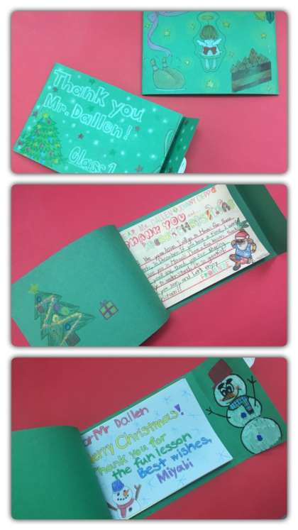 4月から英語の授業でお世話になったC-NETのダレン先生が12月末をもってご退職されることになりました。英語の授業ではみんなが楽しくなるように工夫をしていただいたり、生徒たちがやる気になるように明るく声かけをしていただいたり、とても素晴らしい先生でした。1年生は学年集会でダレン先生に、生徒みんなで作ったメッセージカードをプレゼントしました。各クラスとても個性的で素敵なカードを作ってくれました!さびしくなりますが笑顔でお別れをしました。
