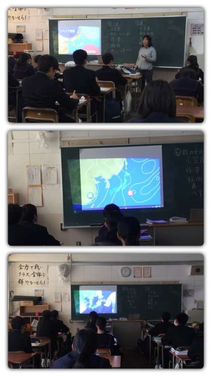 1月25日(金) 5限目は2-2で加藤先生の理科の授業を参観しました。「日本の四季の天気」を単元として、各季節の特徴とその気象の仕組みについて学習していました。映像やワークシートを活用して、先生の質問に次々答えていました。ICT機器を活用すると動画が見れるので、雲の流れや天気の変化を理解するのには最適だと思いました。昨年は台風21号が猛威を振るい大きな被害が出ました。このような気象の学習を通して、人々の生活と自然災害について考えるよい機会にできたらと思います。