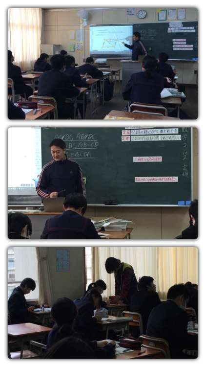 また、公開授業ではありませんが、ついでに2-1の岸本先生の数学の授業をのぞいてみました。思考力を鍛える数学として、三角形の合同の証明問題が行われていました。二つの三角形の合同を証明するために、平行線と錯角、共通の辺など、合同条件を見つけて楽しく解いていました。また、今後はいろいろな問題にチャレンジして、「できた!」「わかった!」をどんどん増やしていけば、ますます楽しくなりますよ!