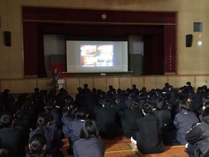 続いて、堀江中学校の卒業生でもあり、地域のことを詳しくご存じの堂前裕一様に講話をお願いし、貴重な写真を見せていただきながらお話を伺いました。昔の堀江の風景や、堀江発症緒企業のお話、昔の堀江中学校の思い出などをお話いただきました。お菓子のグリコや文房具のコクヨの会社が堀江が発祥の地と伺い、とても身近に感じました。
