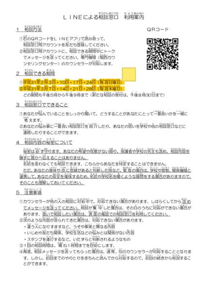 生徒の皆さんが悩みを相談できる窓口をお知らせします。2枚目にはLINEによる相談も受け付けています。LINEの方は、2月は毎週日曜日のみ、3月は毎週木曜日のみ、時間は午前9時から午後9時まで(新たな相談は午後8時30分までの受付)となります。