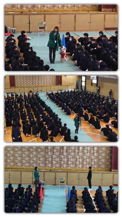 2月25日(月)午後、1・2年生の総合的な学習の時間で人権学習を行いました。テーマは「盲導犬と視聴覚障がい者について学ぶ」ということで、日本ライトハウスの盲導犬訓練所の大西さんに講演をしていただきました。
