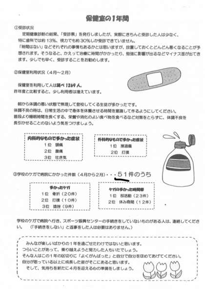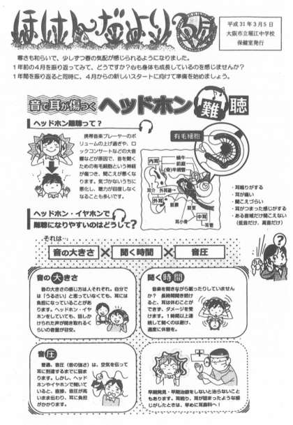 ほけんだよりを発行しました。ヘッドホン・イヤホンと難聴のことについて掲載しています。正しく使って難聴にならないように、是非読んでみてください。