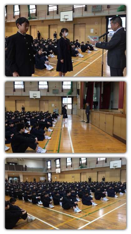 三好先生からは、今年度を振り返り、「時間を守ること」は昨年度以上に達成できたことが良かったと褒めてもらいました。また、明日から春休みに入りますが、休み中の注意事項も守って、安全に生活してほしいこと、特にイオンなどには問題に巻き込まれないよう、保護者と一緒に出かけるよう注意されました。さらに、不安や悩みごとなどは、保護者や先生、友達、SOSダイヤル窓口など相談する人がたくさんいますので、決して一人で抱え込まないようにということも伝えました。