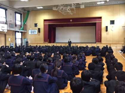 続いて、校長先生からこの1年間の振り返りと未来へのステップに向けたお話をしていただきました。「目標を持って、それに向けて道を描くこと」「具体的に行動を起こすこと」「失敗も含めた経験値をふやしていくこと」など、様々なお話がありました。夢のような近未来に向けて情報や技術はさらに発達していくが、大切なことは心が豊かになること、世界平和を願い、思いやりの心をもち人間的に成長してほしいと話されました。
