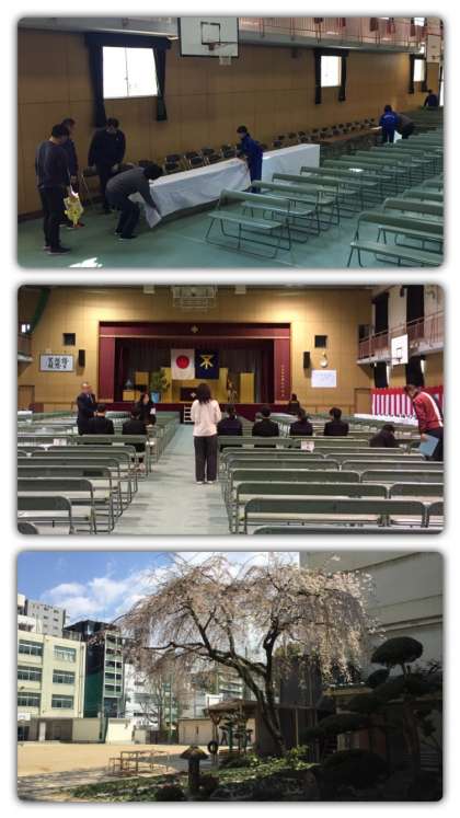 明日4月3日の入学式に備えて、新3年生が会場準備や清掃を丁寧に行ってくれました。また、新入生の入学を今か今かと待ちわびるように、校庭の枝垂れ桜はこの冷え込みに耐え、美しく咲き誇っています。