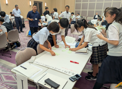 その後、北方領土研究におけるグループワークが行われました。「北方領土問題を解決するために、私たちにできることは何か」との問いに対して考えをふせんに書き、模造紙に貼ってグルーピングを行い、その結果をまとめて発表をしました。他校の生徒とも協力し仲良く協議がすすめられました。