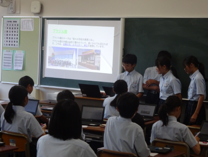 1限目に行われた1年生の取り組みの様子です。大阪関西万博の事後学習として、パビリオンや各国のことを調べて発表する取り組みが行われました。