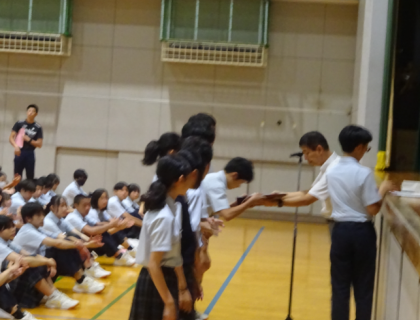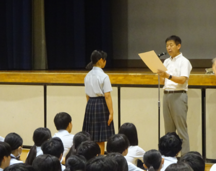 はじめに、吹奏楽部と卓球部に表彰状の伝達が行われました。吹奏楽部は、関西マーチングコンテストに進出し、全国大会を目指します。