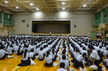 9月も中旬となりましたが、朝から蒸し暑い日となっています。本日は火曜日ですが、全校集会が体育館で行われました。