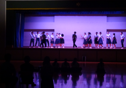 劇のリハーサルでは、本番さながらに照明の「暗転」と「明転」、立ち位置、声の通り、ダンスと、細部にこだわって練習が進められました。