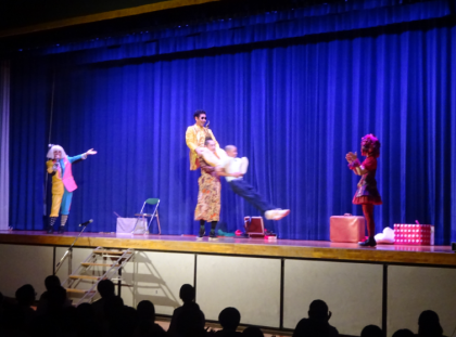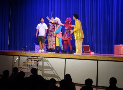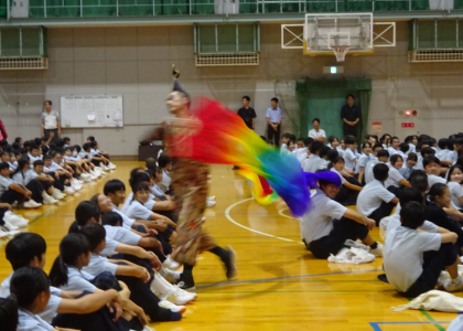 世界各国で活躍するパフォーマンスグループ「to R mansion」をお迎えし、パントマイム、アクロバット、マジックなどを見せていただきました。生徒の飛び入り参加、加えて先生も演者として出演するなど、笑いありの大歓声が体育館に溢れました。