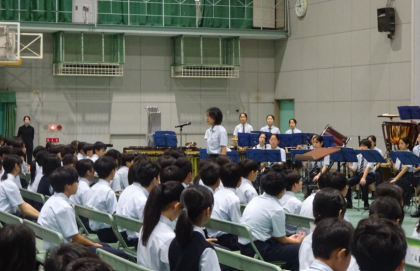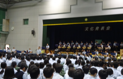 2日目の舞台発表は、吹奏楽部の発表です。開会式での代表生徒、校長先生のあいさつに引き続き、吹奏楽部の演奏が始まりました。