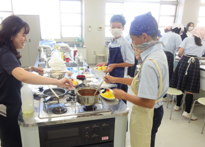 写真は、クッキング体験と探求授業、ゲームプログラミング授業の様子です。みんな興味津々で取り組んでいます。