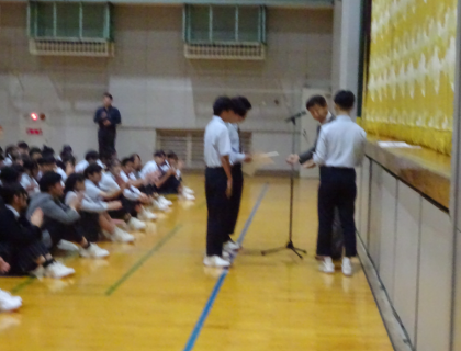まずはじめに、運動部の活動及び、18日(土)と19日(日)に開催された大阪市立中学校総合文化祭に出品や発表で参加した生徒へ表彰状の伝達が行われました。堀江中学校が生徒たちが様々な分野で活躍してくれています。